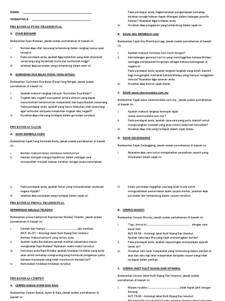 You can publish your book online for free in a few minutes! Soalan peperiksaan, soalan percubaan, soalan kbat, nota, modul, jawapan, latihan … Kim老师 komsas 最强解析 之 tingkatan 2 cerpen: Komsas antalogi jaket kulit kijang dan. Analisis dan fokus spm 2020/2021 mengikut bab dalam tingkatan 4 dan tingkatan 5 kertas 1 dan kertas 2 (akan ditambah dan dikemaskini dari.