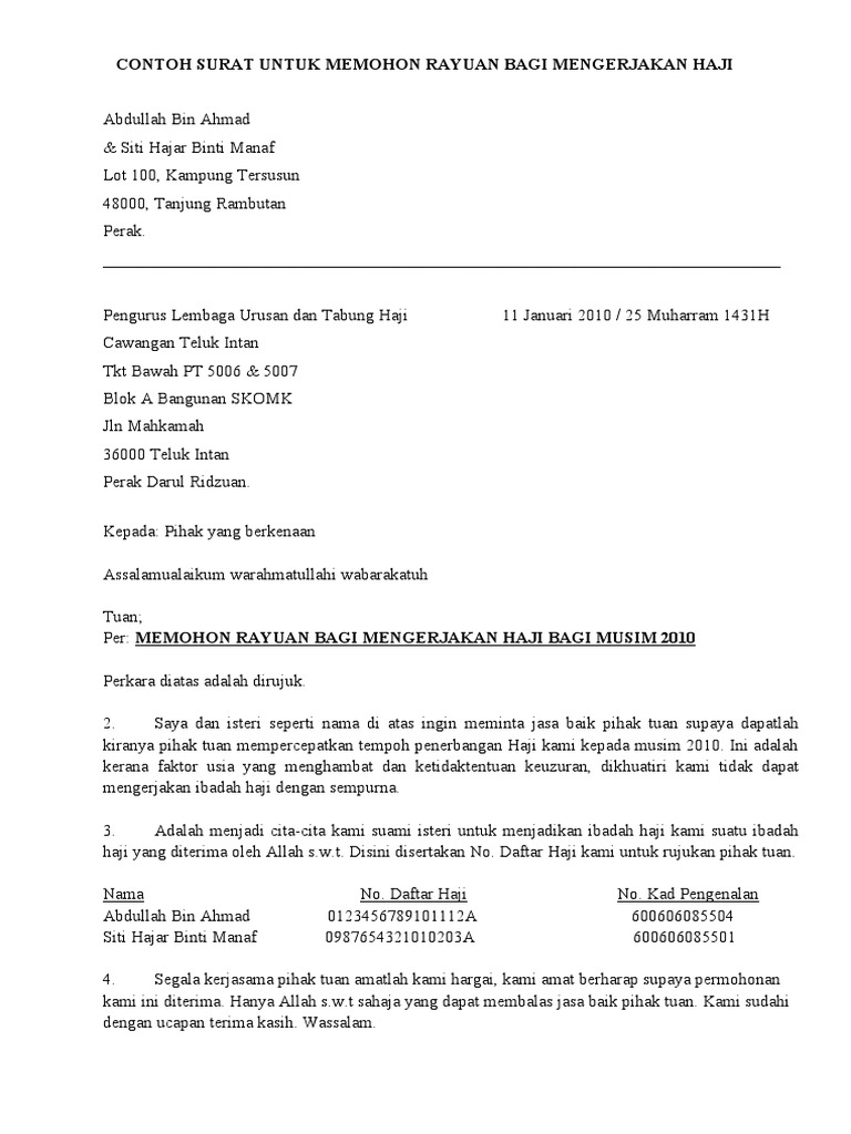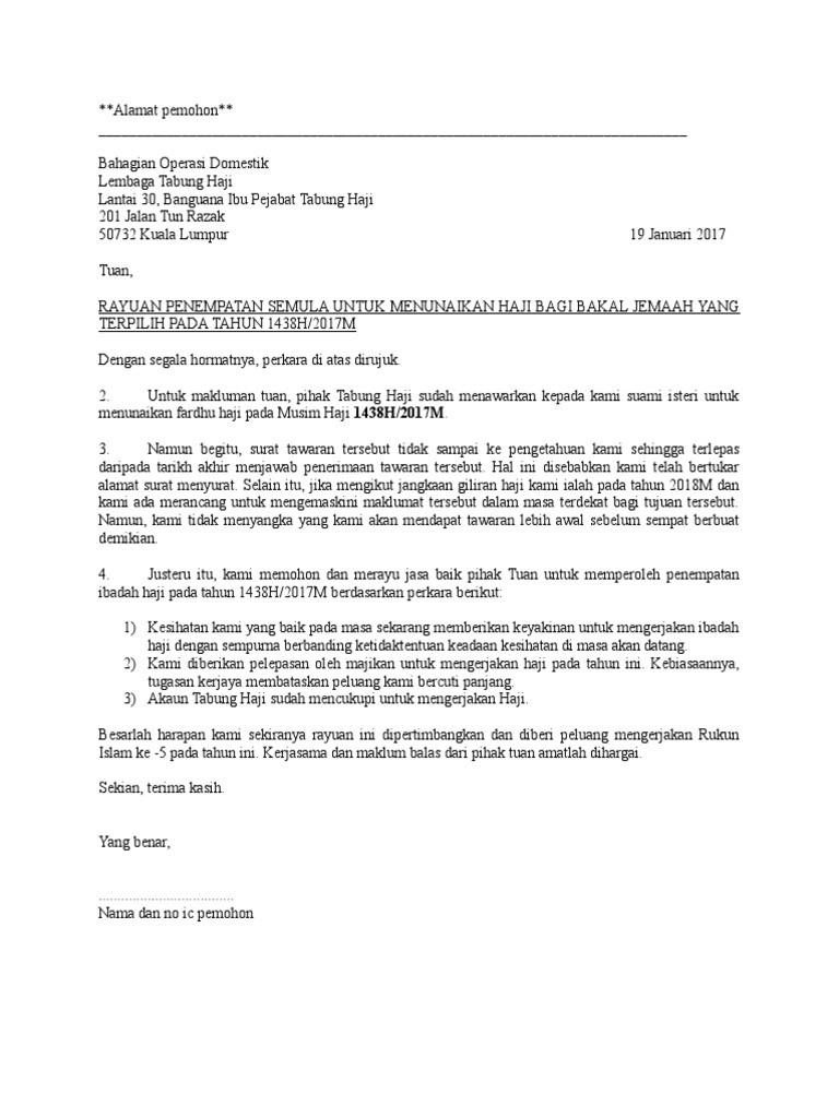 Surat rayuan ialah surat yang digunakan untuk membuat rayuan atau permohonan kali kedua contoh surat rayuan. Yang mengharap, (rogayah binti mokhtar) no k/p hal ini demikian kerana, faktor usia saya yang kian meningkat, dan simpanan kewangan saya sudah mencukupi untuk menunaikan fardhu haji. Desiminasi persyaratan permohonan paspor r.i bagi calon jemaah haji 2017. Surat ini saya tidak sertakan sekali dengan salinan kad pengenalan atau salinan buku simpanan tabung haji. Mereka yang telah menghantar surat rayuan haji perlu mengisi borang rayuan haji dengan mendapatkan borang tersebut dari pejabat cawangan th yang berdekatan atau laman web th bermula 28 januari 2020.